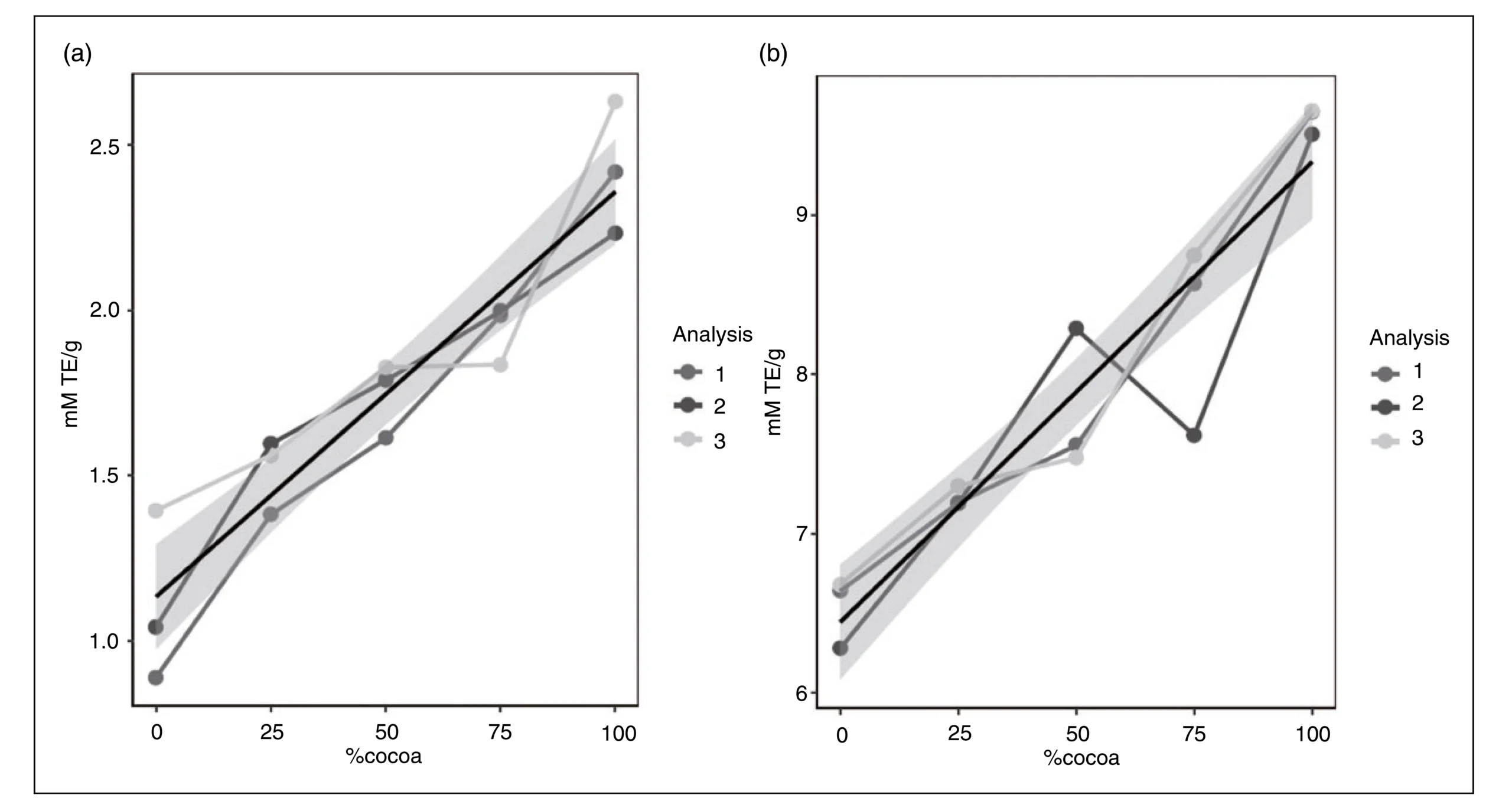 Figure 1. Antioxidant capacity of cocoa-coffee mixtures determined by the DPPH (a) and ORAC (b) methodology (The values 1, 2, 3 correspond to the means of three analyses). concentrations to inhibit a significant number of free radicals. This attribute is desirable in ingredients intended to be used as sources of bioactive compounds of interest in functional foods design, mainly because the high AC of cocoa could achieve similar functional effects with low doses. These results agree with some authors, whose have reported AC values in unfermented cocoa beans based on the DPPH-assay, such as 0.367 mM TE/g dw (Ramirez et al., 2013; Zapata et al., 2013). Thus, the AC described currently in the literature is lower than the presented in this work. This result could be because the unfermented cocoa beans used in this study have undergone a process to concentrate phenolic compounds through a hydroalcoholic treatment which usual exhibit higher concentration.