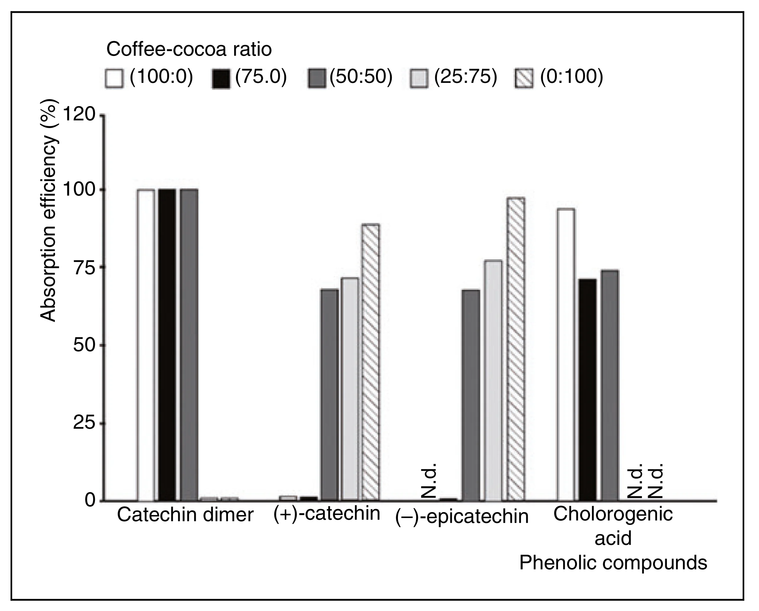 In the case of catechin dimer found in the cocoa-coffee mixtures assessed, this presented an absorption efficiency ranging between 59% and 93%. In this regard, the 100%-coffee extract showed the highest percentage of this compound (93.6%). Although this compound was not identified, it is important to mention that cocoa and coffee can contain this type of phenolic structures. Cocoa flavanols can be monomers (catechin and epicatechin) and dimers or oligomers (procyanidins) (Quinones and Aleixandre, 2012). ~ Regarding the bioavailability of these compounds, some authors have reported that transepithelial transport of procyanidins does not occur or has a low absorption rate (<5%). Mnatsakanyan et al. (2010) also reported the presence of some dimers present in the coffee (carboxylic acids) To the (þ)-catechin was observed to increase transport efficiency in parallel with the cocoa percentage rise in the mixture. This behaviour has a direct relation with the concentration of this compound in the mixes.